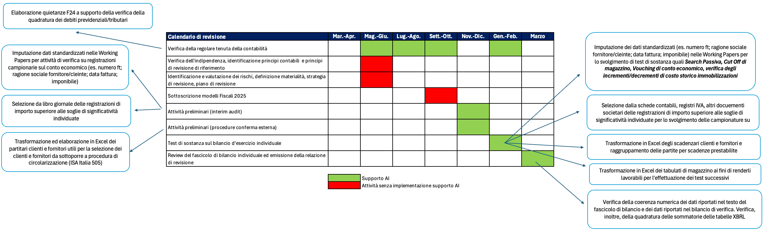 Nella attività di revisione, pertanto, l’AI rappresenta esclusivamente uno strumento di supporto operativo e non potrà mai sostituire il ruolo, il giudizio e la responsabilità del revisore. L’intelligenza artificiale può essere utilizzata per agevolare attività esecutive, ripetitive e di elaborazione dei dati a disposizione, ma tutte le valutazioni sostanziali restano in capo al professionista, il quale mantiene un ruolo attivo nello svolgimento del processo utilizzando questo strumento come supporto per prendere decisioni strategiche basate su una approfondita analisi dei dati in possesso dell’auditor.